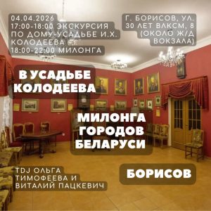 - 13 апреля (понедельник) 20:00. Открытый урок и новый набор в группу аргентинское танго взрослые с нуля. ак Вышелесского 4 (Минский арайонный центр культуры), 1 этаж, рекриация Занятия Понедельник — среда 20:00 -21:00.